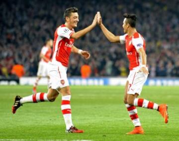 GWP01. LONDRES (REINO UNIDO), 01/10/2014.- Alexis Sánchex (d) del Arsenal celebra tras anotar ante el Galatasaray con su compañero Mesut Ozil (i) hoy, miércoles 1 de octubre de 2014, durante un partido del Grupo D de la Liga de Campeones de la UEFA en Londres (Reino Unido). EFE/GERRY PENNY