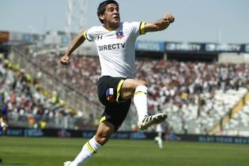 El jugador de Colo Colo Julio Barroso, celebra su gol contra Universidad de Chile durante el partido de primera division disputado en el estadio Monumental de Santiago, Chile.